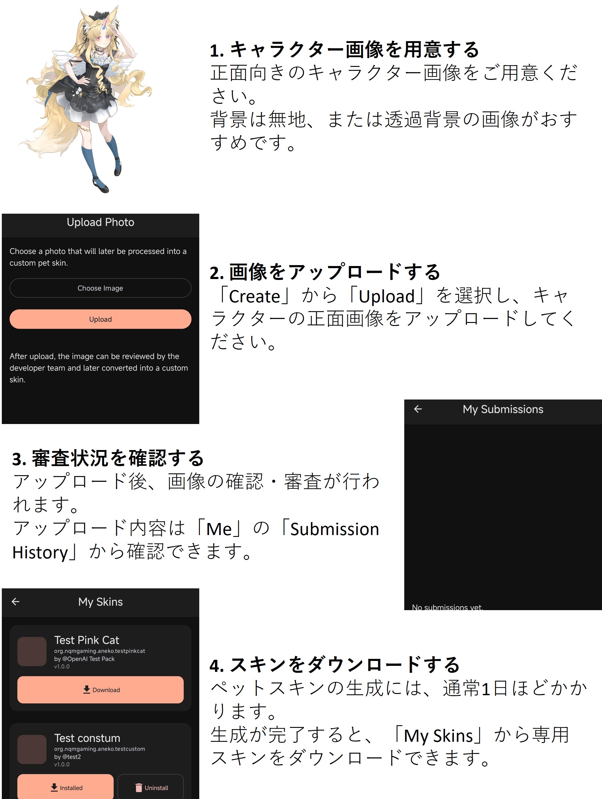 当社のAIは、キャラクターデザインの特徴を抽出し、見た目と動きを組み合わせることで、自由に動き回れるキャラクターデータを生成します。さらに、そのデータを線画風・シンプルなタッチに整え、キャラクターをより生き生きと、愛らしく表現します。完成したキャラクターモーションは自動的に専用アカウントへ追加され、あなただけの電子ペットとして楽しめます。